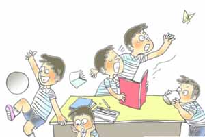 1.无目的性活动过多。比如,在课堂上,多动症儿童会毫无目的地摇桌子、晃椅子,即使受到老师的提醒、制止或批评,马上又不由自主地重复原来的小动作,或更换为乱翻书本,东张西望、歪来歪去,或咬铅笔,切橡皮,招惹邻座的同学。平时手脚不停,无目的地乱闯、乱跑。大人说话时迫不及待地插嘴,常对同伴有莫名其妙的挑衅行为。