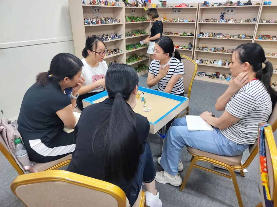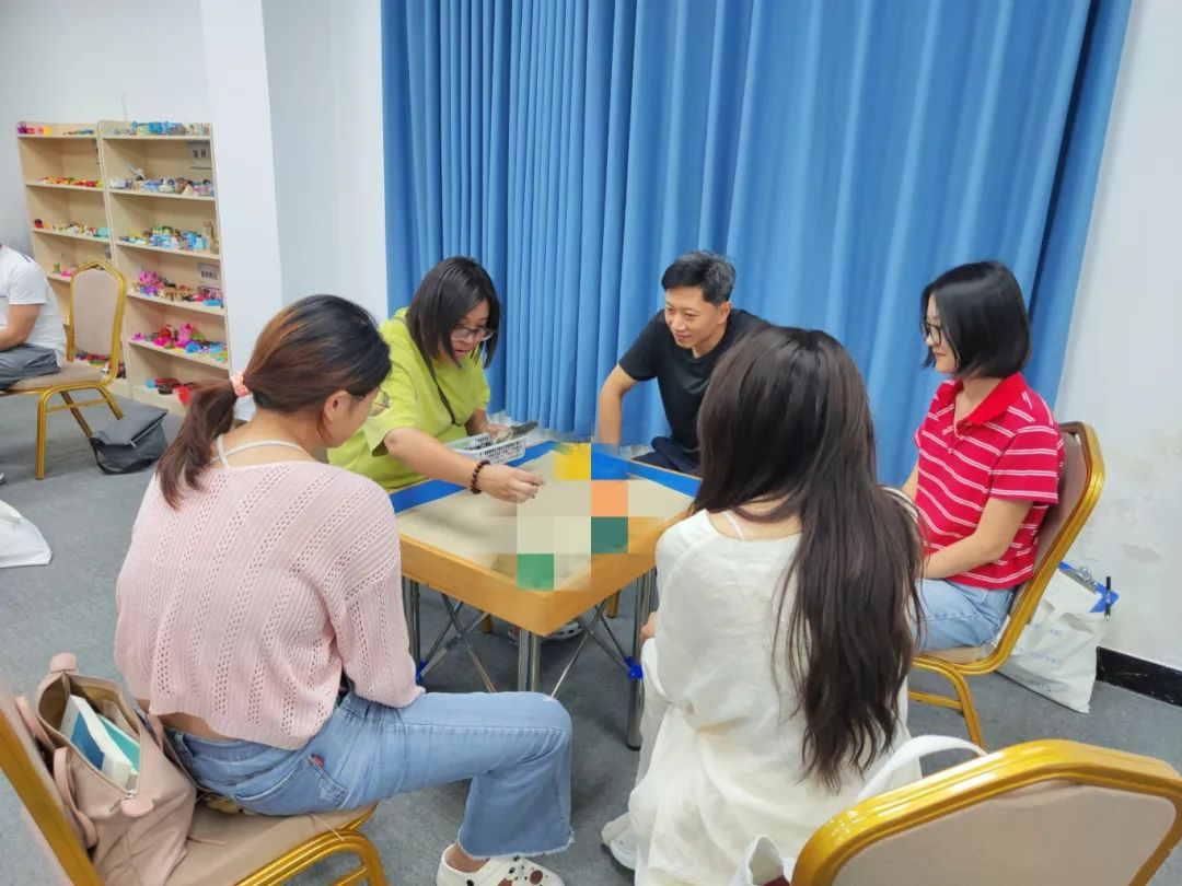 实操过程中,学员们分组进行沙盘游戏操作。大家遵循相关原则和李老师设置的实操训练方案,在沙具选择与摆放上积极互动,展现出良好的协作与理解能力。扮演来访的学员在沙盘前进行操作,负责咨询的学员则各司其职,有的专注引导表达,有的细致记录,有的保障环境无干扰,整个过程有条不紊。