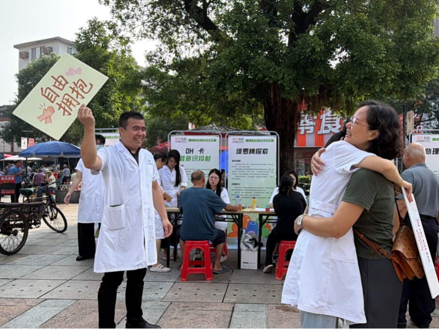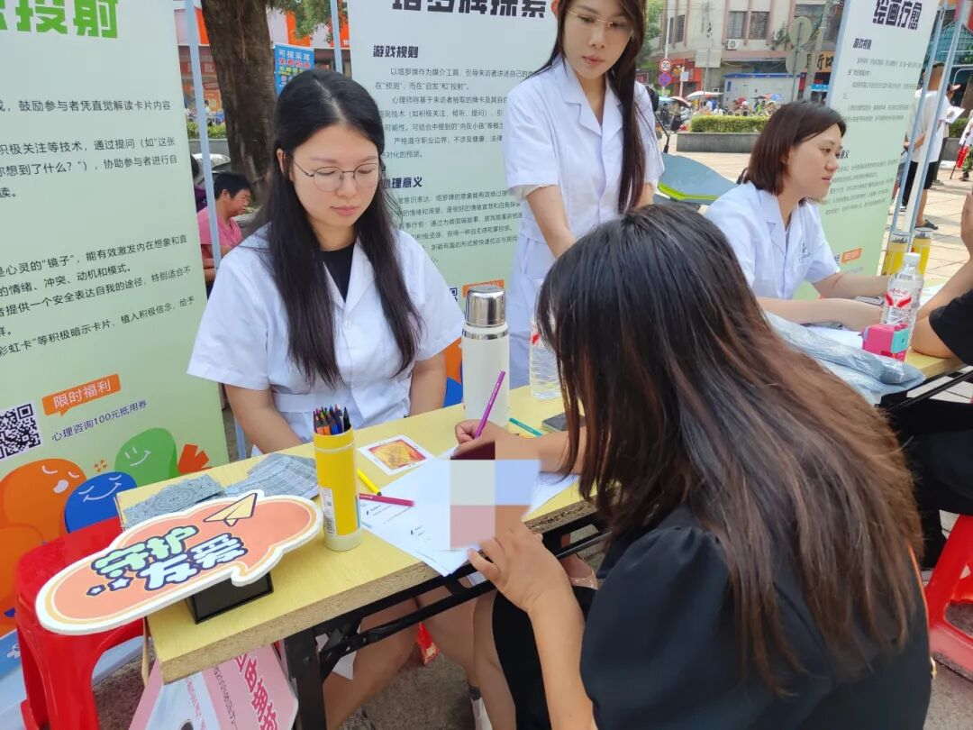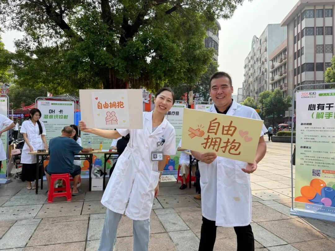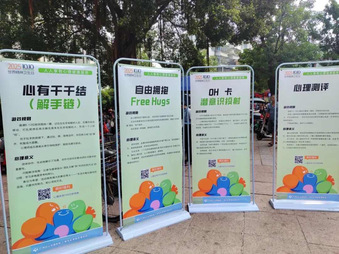 此外,心理游戏区设置了 “自由拥抱”“趣味射击情绪气球”“心有千千结(解手链)”“OH 卡潜意识投射” 等多元互动项目,吸引各年龄段居民踊跃参与。“自由拥抱” 环节,工作人员手持 “自由拥抱” 标牌,向过往居民传递微笑与免费拥抱。