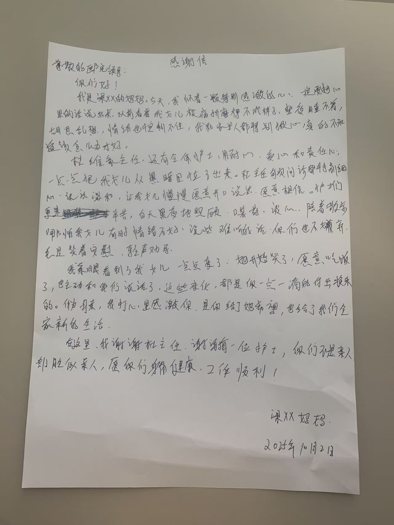 杜主任和各位主任,还有全体护士,用耐心、爱心和责任心,一点一点把我女儿从黑暗里拉了出来。杜主任每次问诊都特别细心、说话温和,让我女儿慢慢愿意开口说话、愿意相信。护士们更是辛苦,白天黑夜地照顾、喂药、谈心、陪着散步。哪怕我女儿有时情绪不好、说些难听的话,你们也不嫌弃,总是笑着安慰、轻声劝导。
