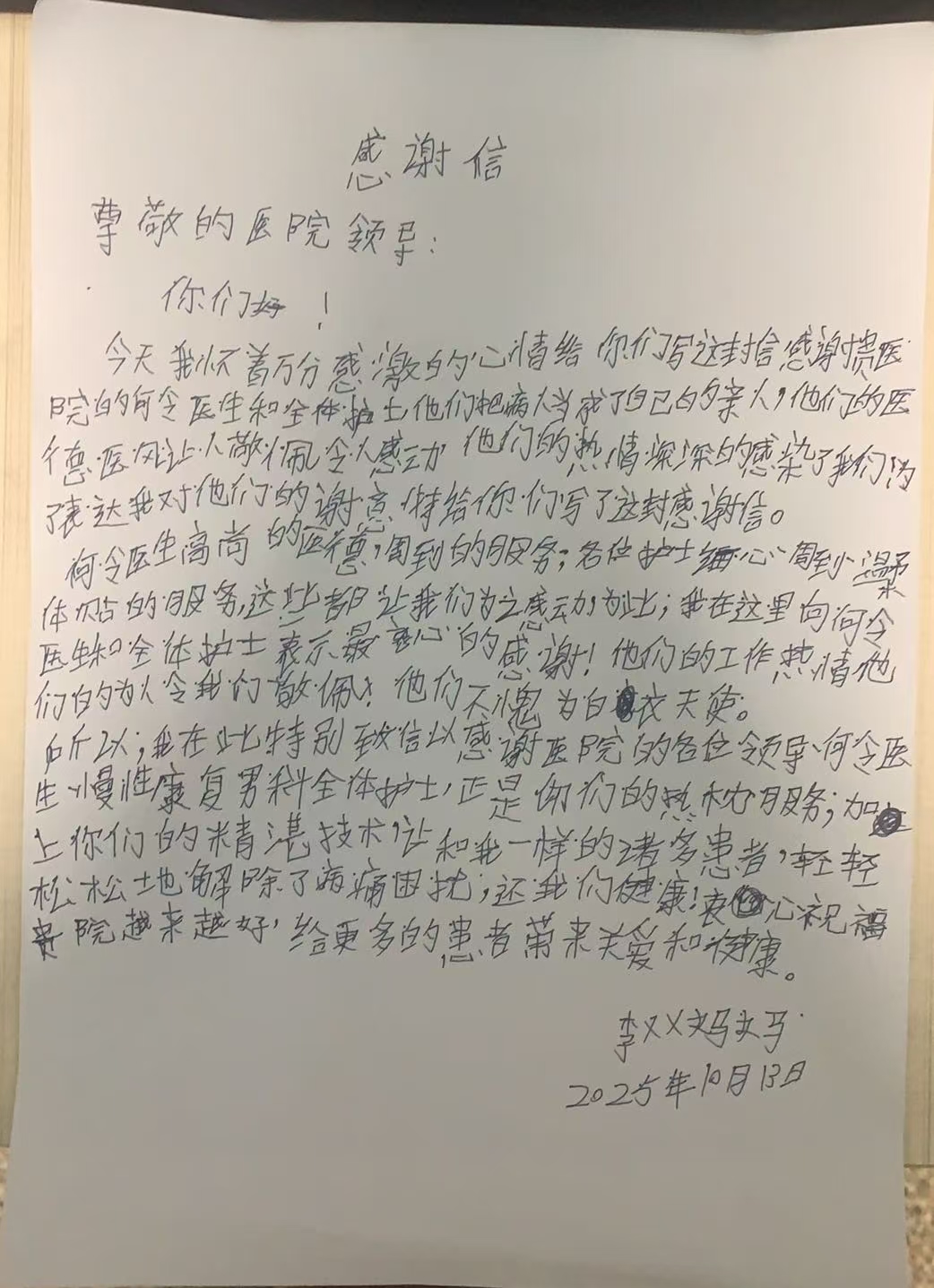 所以,我在此特别致信以感谢医院的各位领导、何令医生、慢性康复男科全体护士,正是你们的热忱服务,加上你们的精湛技术,让和我一样的诸多患者,轻轻松松地解除了病痛困扰,还我们健康!衷心祝福贵院越来越好,给更多的患者带来关爱和健康。