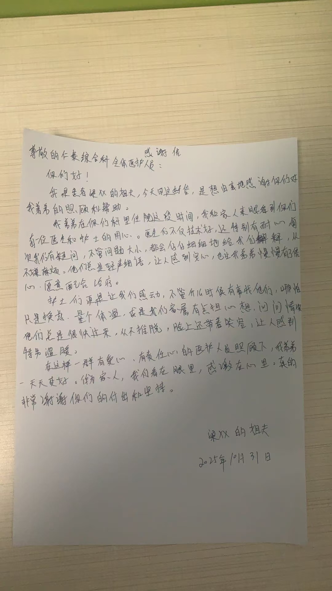 我是患者梁 XX 的姐夫,今天写这封信,是想由衷地感谢你们对我弟弟的照顾和帮助。