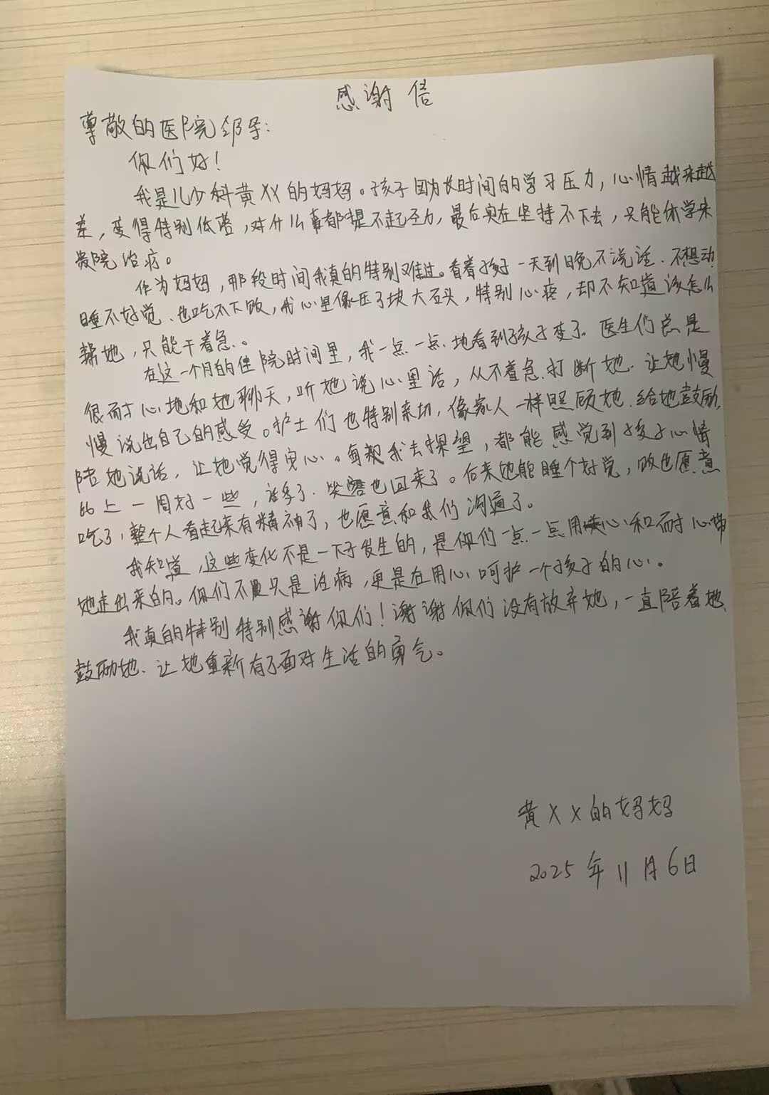 在这一个月的住院时间里,我一点一点地看到孩子变了。医生们总是很有耐心地和她聊天,听她说心里话,从不着急打断她,让她慢慢说出自己的感受。护士们也特别亲切,像家人一样照顾她、给她鼓励、陪她说话,让她觉得安心。每次我去探望,都能感觉到孩子心情比上一周好了一些,话多了,笑容也回来了。后来她能睡个好觉,饭也愿意吃了,整个人看起来有精神了,也愿意和我们沟通了。