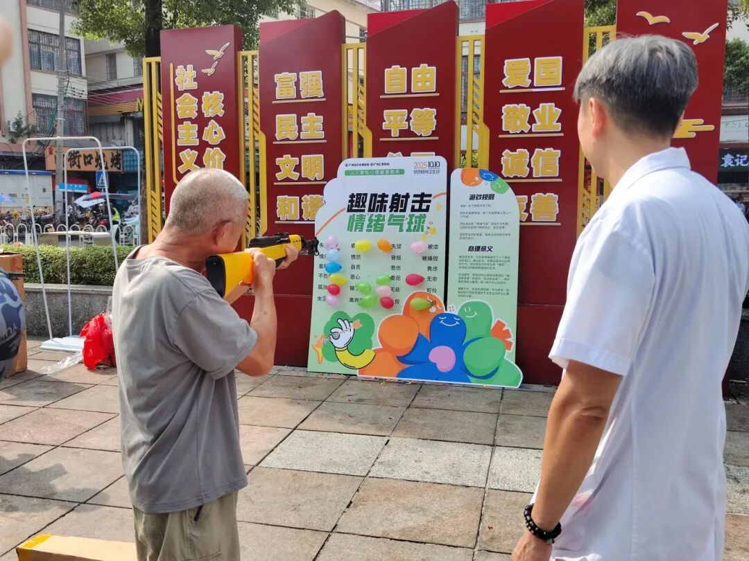 此外,心理游戏区设置了 “自由拥抱”“趣味射击情绪气球”“心有千千结(解手链)”“OH 卡潜意识投射” 等多元互动项目,吸引各年龄段居民踊跃参与。“自由拥抱” 环节,工作人员手持 “自由拥抱” 标牌,向过往居民传递微笑与免费拥抱。