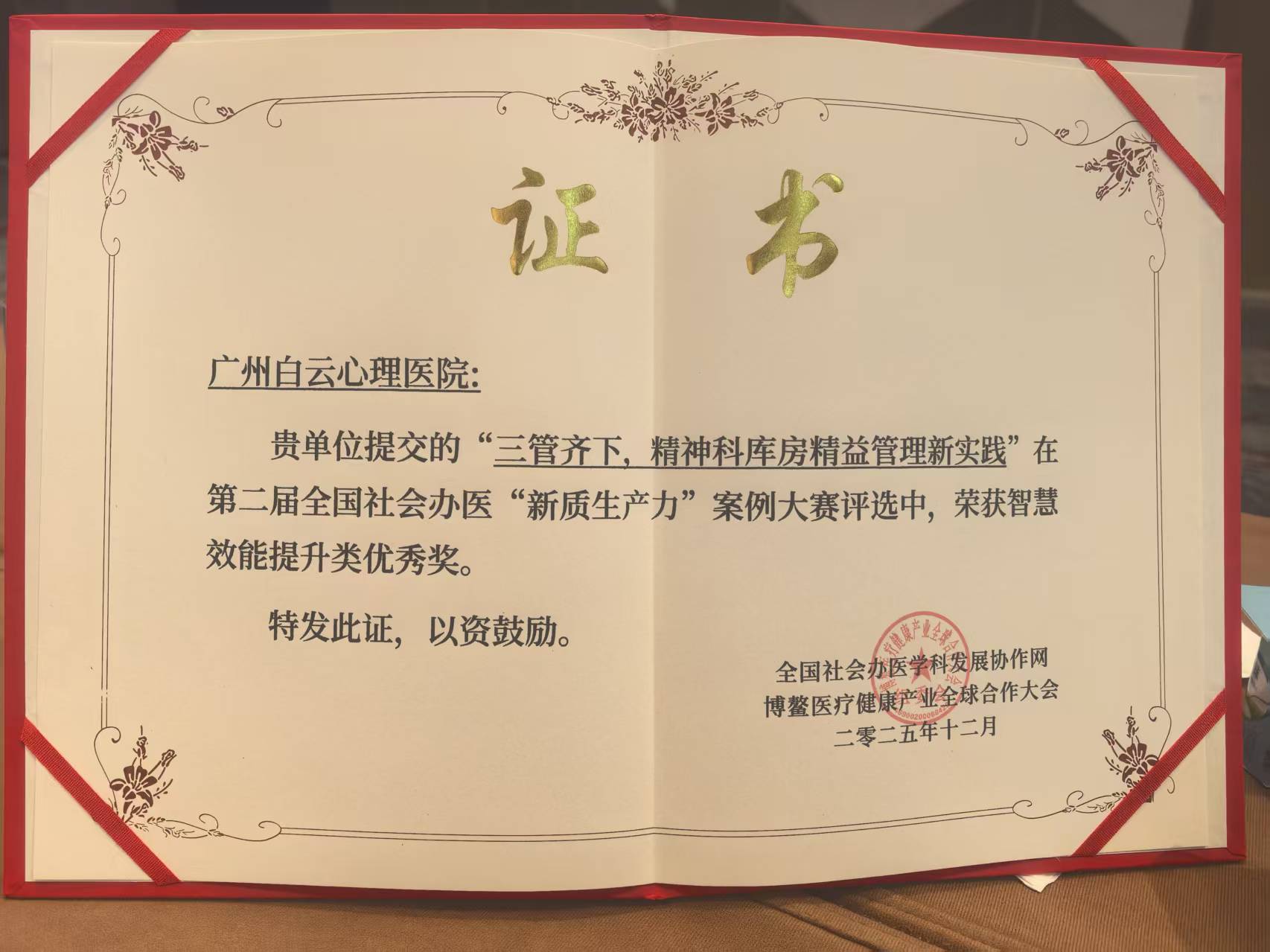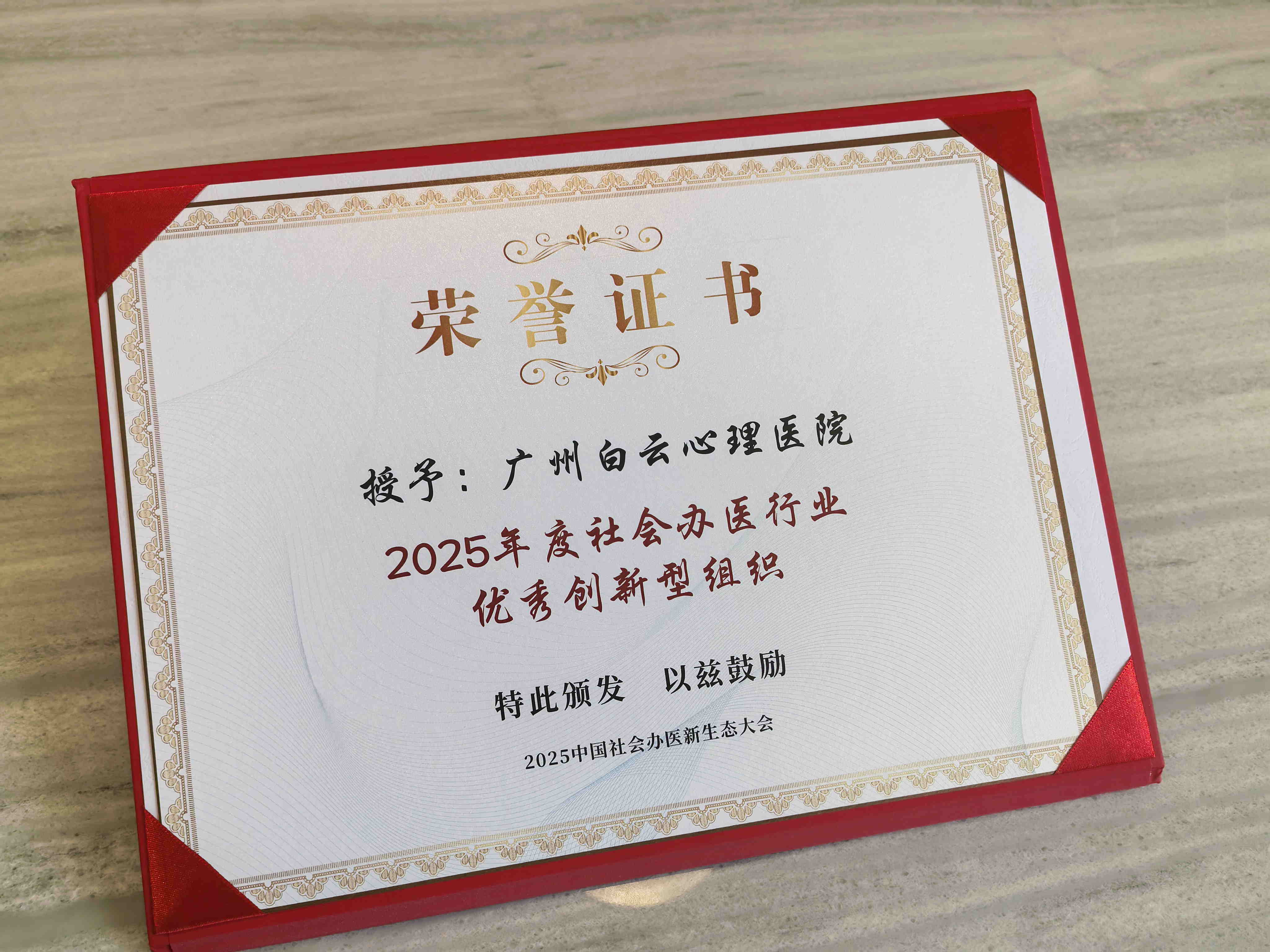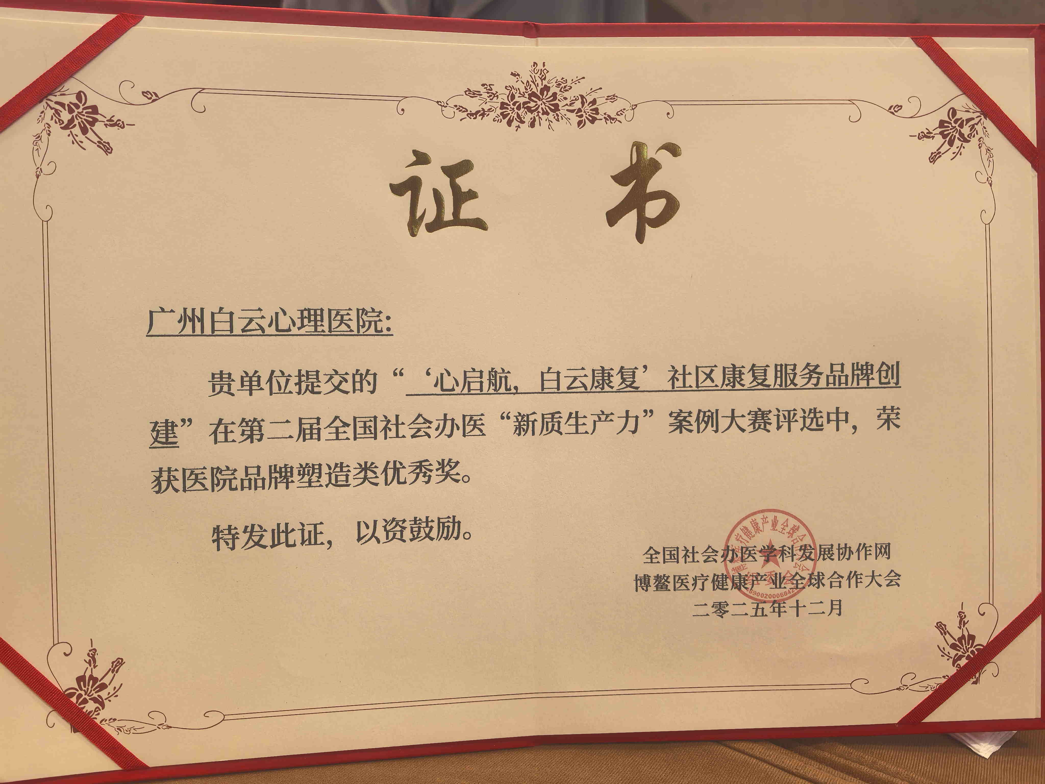 更值得关注的是,广州白云心理医院从全国 120 余家参评机构中脱颖而出,成功获评 “2025 年度社会办医行业优秀创新型组织*,全国仅 15 家机构获此殊荣。这一荣誉不仅是对医院单项案例创新的认可,更是对医院整体创新生态建设的高度肯定 。