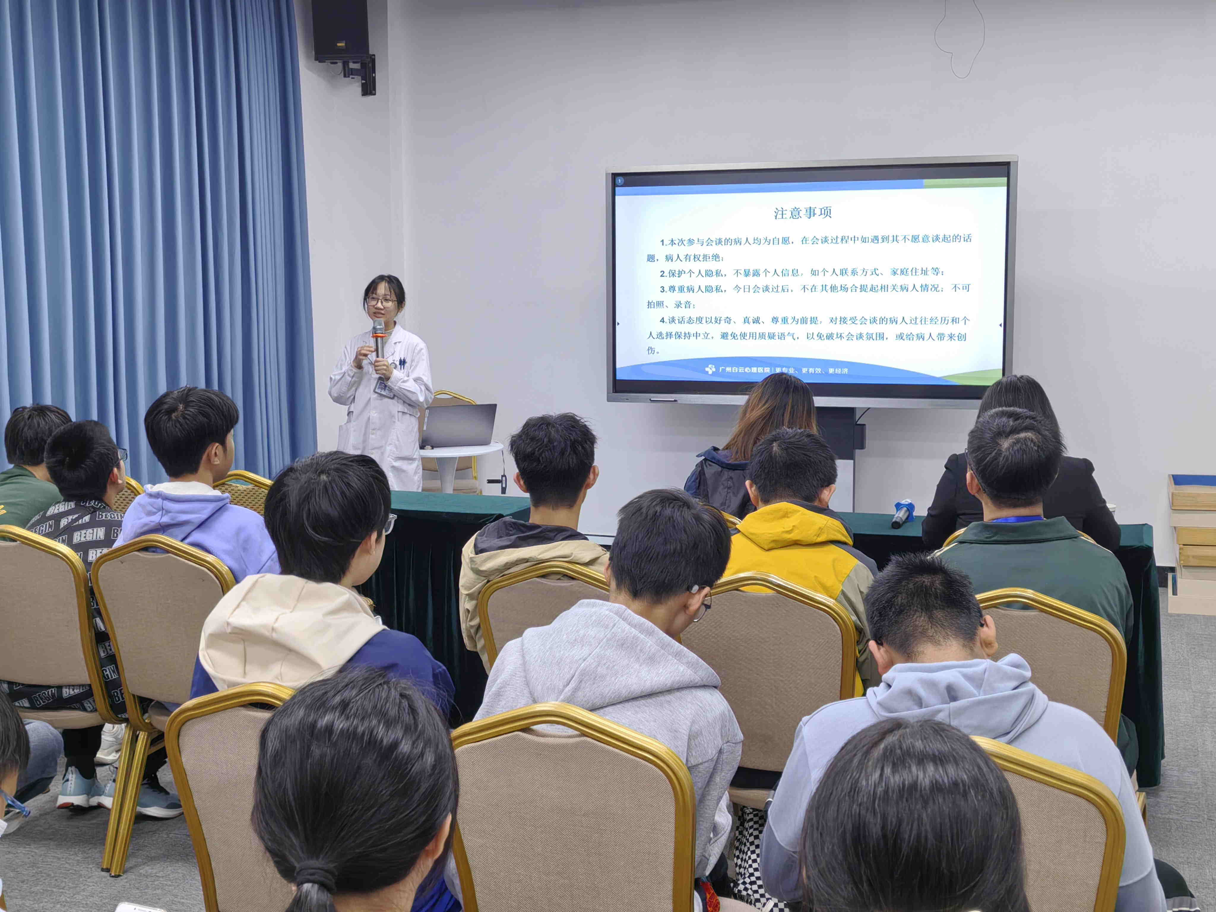 参观结束后,交流团齐聚会议室。广州白云心理医院、广州仁泰医院执行院长胡誉怀致辞,对同学们的到访表示热烈欢迎,他介绍道:“广州白云心理医院和广州仁泰医院深耕心理健康与成瘾治疗领域,成瘾医学科作为广州仁泰医院核心科室,与广州白云心理医院搭建‘生理脱毒 - 心理干预 - 社会回归’全链条康复体系,同时深入学校、社区开展禁毒科普,以专业力量守护身心健康。”